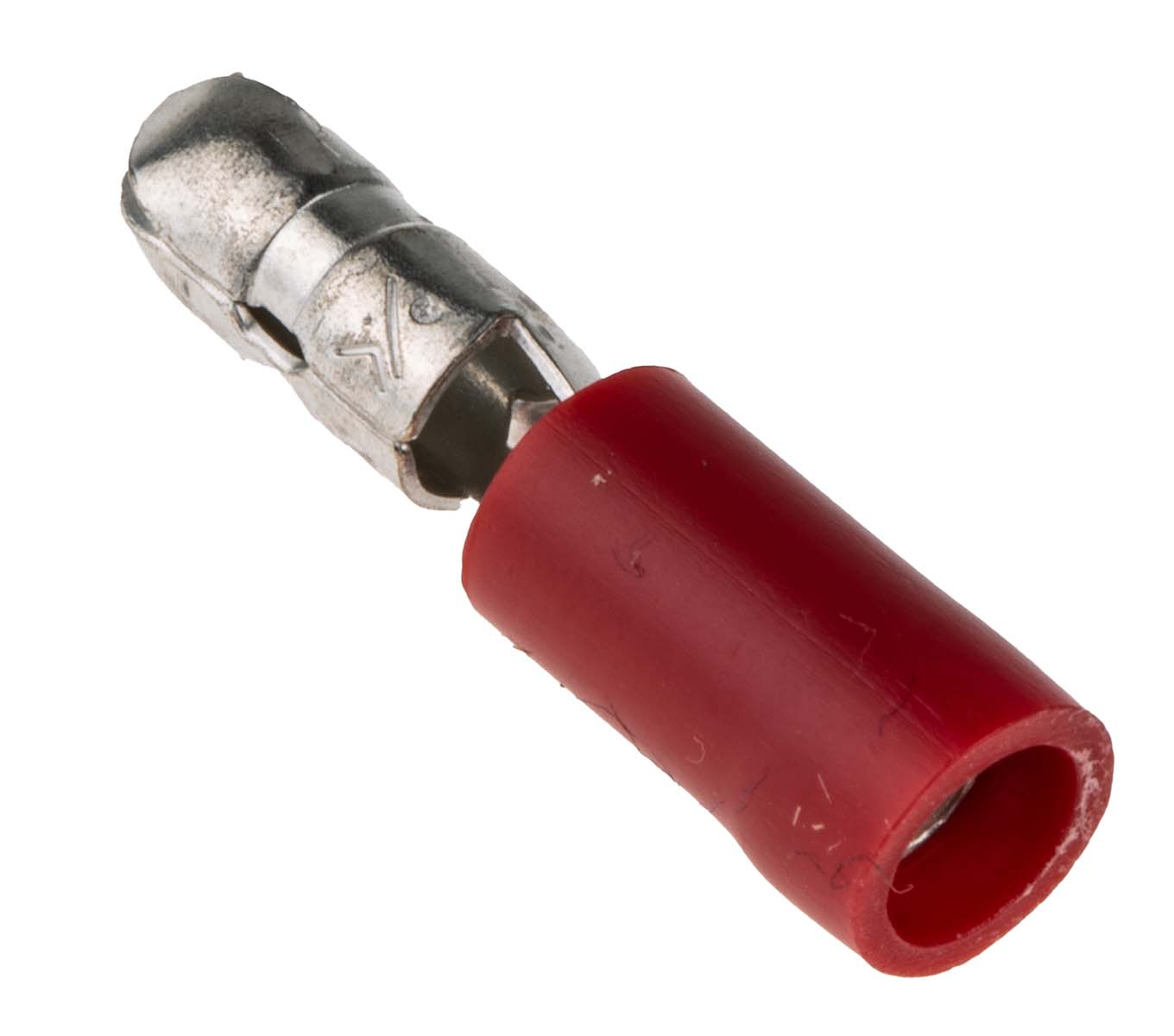 This is Insulated Male Crimp Bullet Connector 0.5mm² to 1.5mm² 22AWG to 16AWG 4.3mm Bullet diameter Red manufactured by RS Pro. The manufacturer part number is 534-301. It is supplied as unshrouded. The wire has a maximum size of 1.5mm². It has about 4.3mm bullet diameter . In addition, male is the available "Gender" of the product. It has a decent red colour. While the minimum wire size AWG includes 22awg. It has a robust nylon insulation material. The high-quality tin is used as contact plating material. It has an overall length of 21mm. Insulation Option: insulated. Its maximum wires size includes 16awg. On the other hand, the wire has 0.5mm² of minimum size. The product is made from sturdy brass materials.