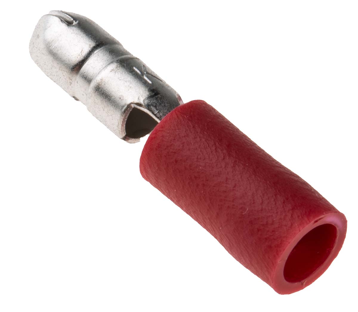 This is Insulated Male Crimp Bullet Connector 0.5mm² to 1.5mm² 22AWG to 16AWG 4mm Bullet diameter Red manufactured by RS Pro. The manufacturer part number is 624-1342. The wire has a maximum size of 1.5mm². It has about 4mm bullet diameter . In addition, male is the available "Gender" of the product. It has a decent red colour. While the minimum wire size AWG includes 22awg. It has a robust vinyl insulation material. The high-quality tin is used as contact plating material. It has an overall length of 21.5mm. Insulation Option: insulated. Its maximum wires size includes 16awg. On the other hand, the wire has 0.5mm² of minimum size. The product is made from sturdy brass materials.