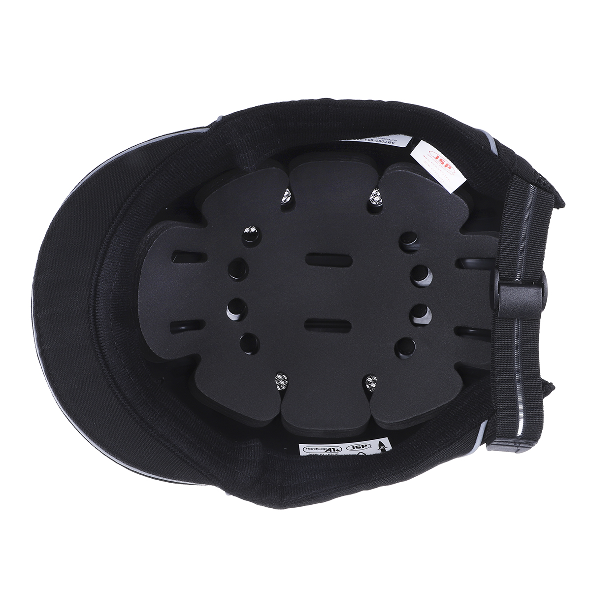 This is Black HDPE Canvas Safety Cap manufactured by JSP. The manufacturer part number is ABT000-001-100. It has an adjustable feature no . It complies with EN812 yes . Its cap is made up of high density polyethylene (hdpe) material . It has a washable machine included yes . It has a decent black colour. It has a micro type peak . It has integral sweatband feature yes . The head size includes 52 - 65cm. It has a/an hdpe as protective material .