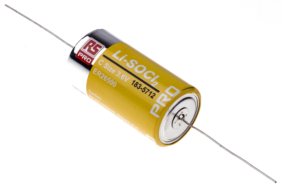 This is ER26500 C size Long PIN manufactured by RS PRO. The manufacturer part number is 183-5712. It has a/an lithium thionyl chloride chemistry . The module has the capacity of 8.5ah. The product is available in c size. The number of supplied batteries is/are 1 . It comes with a/an er26500 IEC name . The nominal voltage of the product is 3.6v. The quantity of the pack is 1 . The terminal is a standard type. Its brand range is rs pro .
