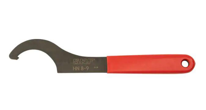 This is HN8-9 58mm Hook Spanner manufactured by SKF. The manufacturer part number is HN 8-9. It has a minimum 58mm jaw capacity . It has a maximum 65mm jaw capacity .