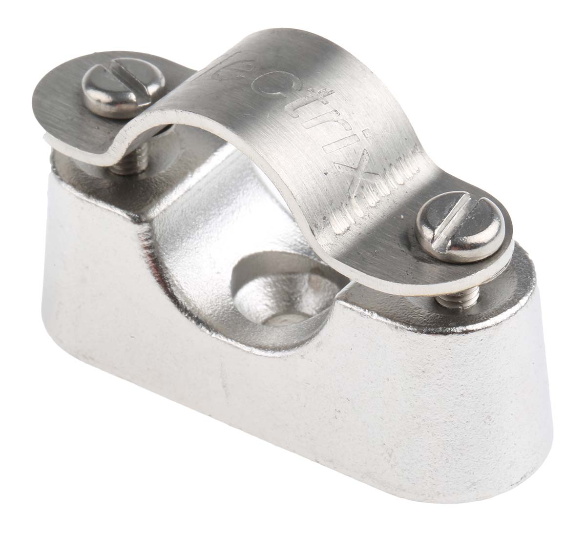 This is 316 Stainless Steel Natural Saddle Clamp 20mm manufactured by RS Pro. The manufacturer part number is 471-1300. It has a decent silver colour. The product is made from highly stable and reliable 316 stainless steel. It includes a clamp jumper style cable clamp/clip . Where they allow screw affixing mechanism. The bundle has a maximum diameter of 20mm. Its dimensions L x W x D are about 19.3 x 18.2mm .