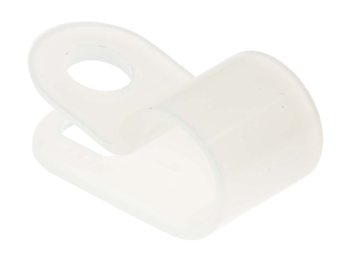 This is 6.4mm Natural Nylon P Clip manufactured by RS Pro. The manufacturer part number is 479-544. It has a decent natural colour. The product is made from highly stable and reliable nylon 66. It includes a cable clamp style cable clamp/clip . Furthermore, the product is 10 mm wide. The bundle has a maximum diameter of 6.35mm. Where they allow screw affixing mechanism.