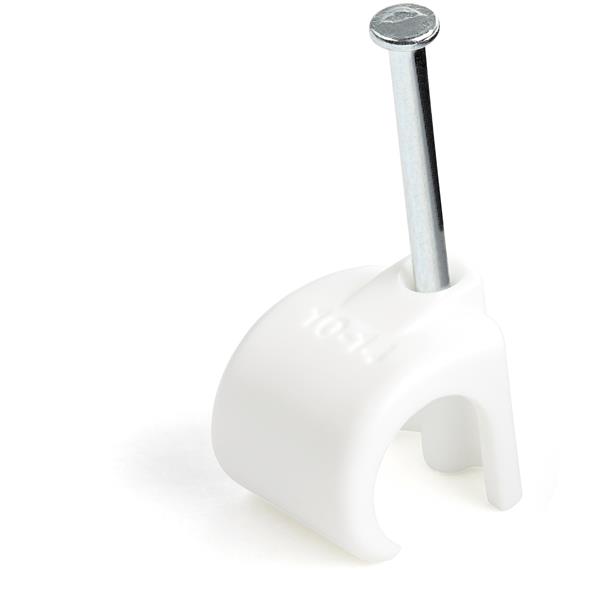 This is White Polyethylene Cable Clips With Nail 14mm Max. Bundle manufactured by StarTech.com. The manufacturer part number is CBMNMCC4. It has a decent white colour. The product is made from highly stable and reliable polyethylene. It includes a clamp collars with nail style cable clamp/clip . The bundle has a maximum diameter of 14mm. Where they allow nail affixing mechanism.