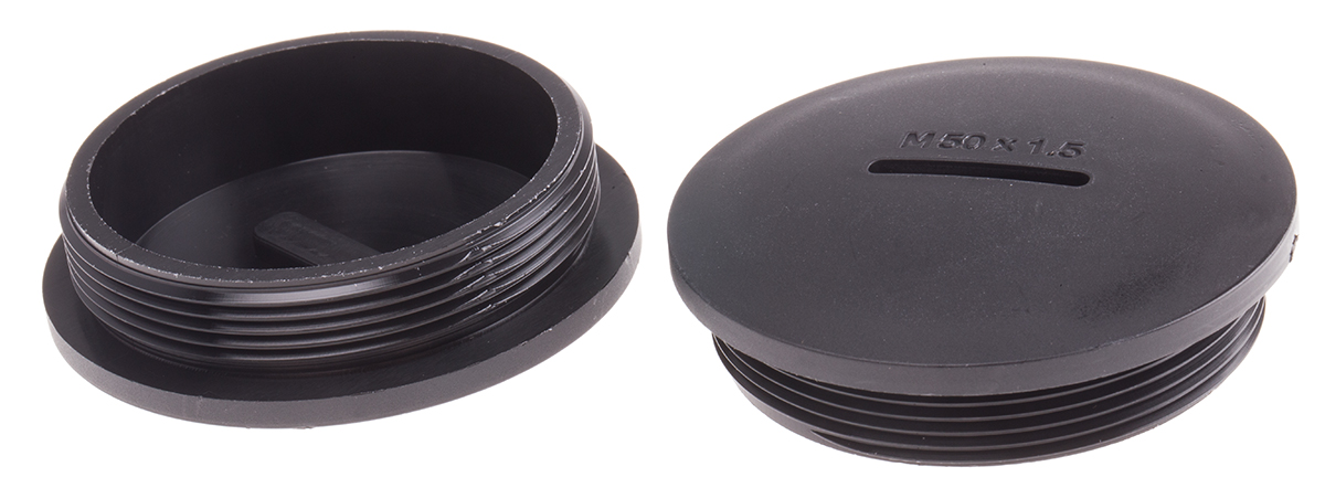 This is Black M50 x 1.5 Threaded Blanking Plug Nylon 66 49.9mm manufactured by RS Pro. The manufacturer part number is 865-9767. Its diameter is 55.5mm. The product complies with all safety standards, such as ul 94v-2. The product 86597, is a highly preferred choice for users. It has a decent black colour. The product is made from highly stable and reliable nylon 66. The plug is a highly reliable blanking with long service life. It has a typical thread size of m50. Has a hole diameter of 49.9mm. It comes as a threaded product.