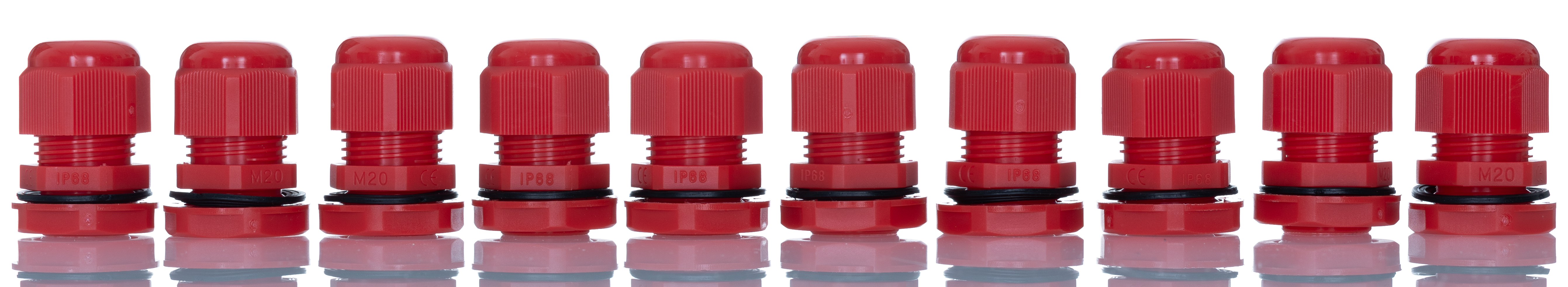 This is M20 Red Nylon IP68 Cable Gland With Locknut manufactured by HellermannTyton. The manufacturer part number is NGM20S-RED. The product complies with all safety standards, such as rohs compliant, ul 94 v-2. The minimum cable diameter is 6mm. It is IP rated with ip68. The product ngm, is a highly preferred choice for users. It has a decent red colour. The product is made from highly stable and reliable nylon 66. It has a typical thread size of m20. The product has -40 → +100 °c of operating temperature range. Whereas, the minimum operating temperature of the product is -40°c. While the maximum dimeter of the cable is 12mm. Locknut included yes . It has a maximum operating temperature of +100°c.