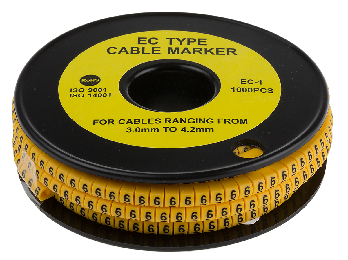 This is Slide On Cable Marker 6 Black on Yellow 3 → 4.2mm Dia. Range 1000 markers manufactured by RS Pro. The manufacturer part number is 812-0821. The product complies with all safety standards, such as rohs compliant. The minimum cable diameter is 3mm. The product has maximum of +85 °c of operating temperature range. It has a printable feature no . It has a decent black on yellow colour. The product is made from highly stable and reliable pvc. Whereas, its overall cable diameter range is 3 → 4.2mm . Its accurate length is 4mm. A bespoke product is highly resistant to greases, oils. Where they allow slide on affixing mechanism. While the maximum dimeter of the cable is 4.2mm. It has a maximum operating temperature of +85°c. Legend Information: 6. Available in 1000 quantity.