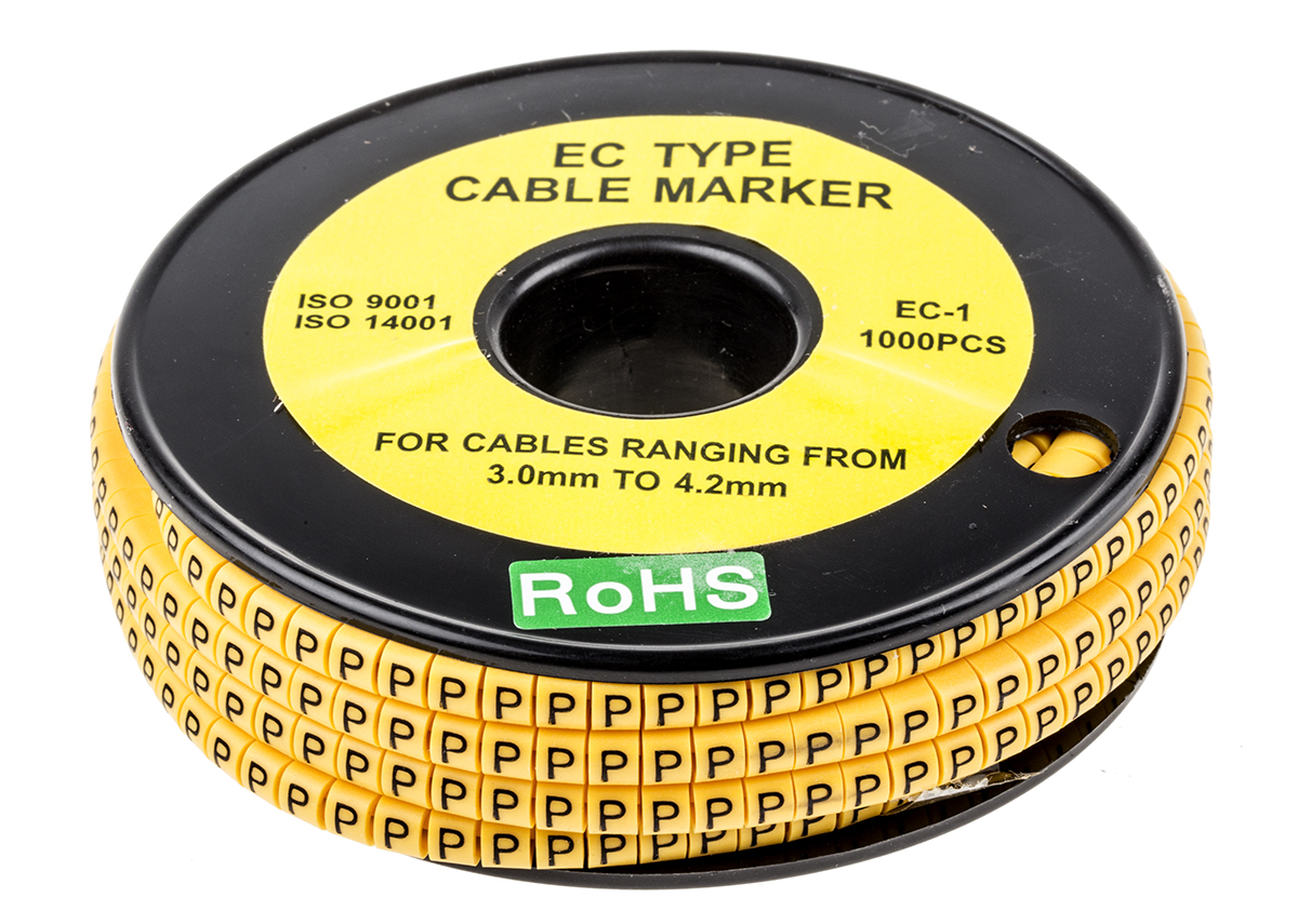 This is Slide On Cable Marker Pre-printed P Black on Yellow 3 → 4.2mm Dia. Range manufactured by RS Pro. The manufacturer part number is 812-0880. The product complies with all safety standards, such as rohs compliant. The minimum cable diameter is 3mm. The product has maximum of +85 °c of operating temperature range. It has a printable feature no . It has a decent black on yellow colour. The product is made from highly stable and reliable pvc. Whereas, its overall cable diameter range is 3 → 4.2mm . Its accurate length is 4mm. A bespoke product is highly resistant to greases, oils. Where they allow slide on affixing mechanism. While the maximum dimeter of the cable is 4.2mm. It has a maximum operating temperature of +85°c. Legend Information: p. Available in 1000 quantity.