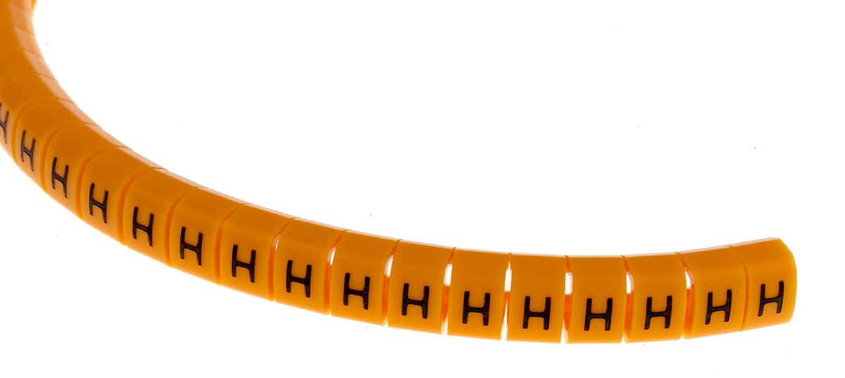 This is Snap On Cable Marker Pre-printed H Black on Orange 4 → 5mm Dia. Range manufactured by RS Pro. The manufacturer part number is 812-1449. The product complies with all safety standards, such as rohs compliant, ul. The minimum cable diameter is 4mm. It has a printable feature no . It has a decent black on orange colour. The product is made from highly stable and reliable nylon 6. Whereas, its overall cable diameter range is 4 → 5mm . Its accurate length is 4mm. Where they allow snap on affixing mechanism. While the maximum dimeter of the cable is 5mm. Legend Information: h. Available in 100 quantity.