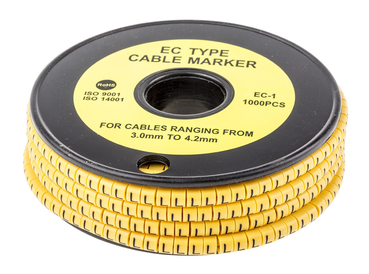 This is Slide On Cable Marker L Black on Yellow 3 → 4.2mm Dia. Range 1000 markers manufactured by RS Pro. The manufacturer part number is 812-0871. The product complies with all safety standards, such as rohs compliant. The minimum cable diameter is 3mm. The product has maximum of +85 °c of operating temperature range. It has a printable feature no . It has a decent black on yellow colour. The product is made from highly stable and reliable pvc. Whereas, its overall cable diameter range is 3 → 4.2mm . Its accurate length is 4mm. A bespoke product is highly resistant to greases, oils. Where they allow slide on affixing mechanism. While the maximum dimeter of the cable is 4.2mm. It has a maximum operating temperature of +85°c. Legend Information: l. Available in 1000 quantity.