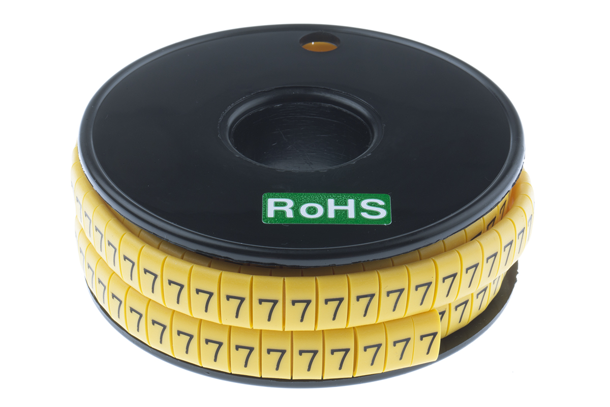 This is Slide On Cable Marker 7 Black on Yellow 3.5 → 7mm Dia. Range 500 markers manufactured by RS Pro. The manufacturer part number is 812-1091. The product complies with all safety standards, such as rohs compliant. The minimum cable diameter is 3.5mm. It has a printable feature no . It has a decent black on yellow colour. The product is made from highly stable and reliable pvc. Whereas, its overall cable diameter range is 3.5 → 7mm . Its accurate length is 5mm. A bespoke product is highly resistant to greases, oils. Where they allow slide on affixing mechanism. While the maximum dimeter of the cable is 7mm. Legend Information: 7. Available in 500 quantity.