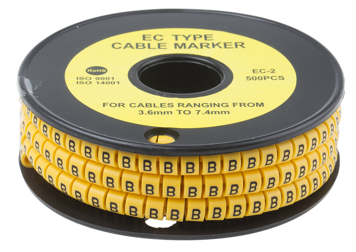 This is Slide On Cable Marker Pre-printed B Black on Yellow 3.6 → 7.4mm Dia. Range manufactured by RS Pro. The manufacturer part number is 812-0972. The product complies with all safety standards, such as rohs compliant. The minimum cable diameter is 3.6mm. The product has maximum of +85 °c of operating temperature range. It has a printable feature no . It has a decent black on yellow colour. The product is made from highly stable and reliable pvc. Whereas, its overall cable diameter range is 3.6 → 7.4mm . Its accurate length is 5mm. A bespoke product is highly resistant to greases, oils. Where they allow slide on affixing mechanism. While the maximum dimeter of the cable is 7.4mm. It has a maximum operating temperature of +85°c. Legend Information: b. Available in 500 quantity.