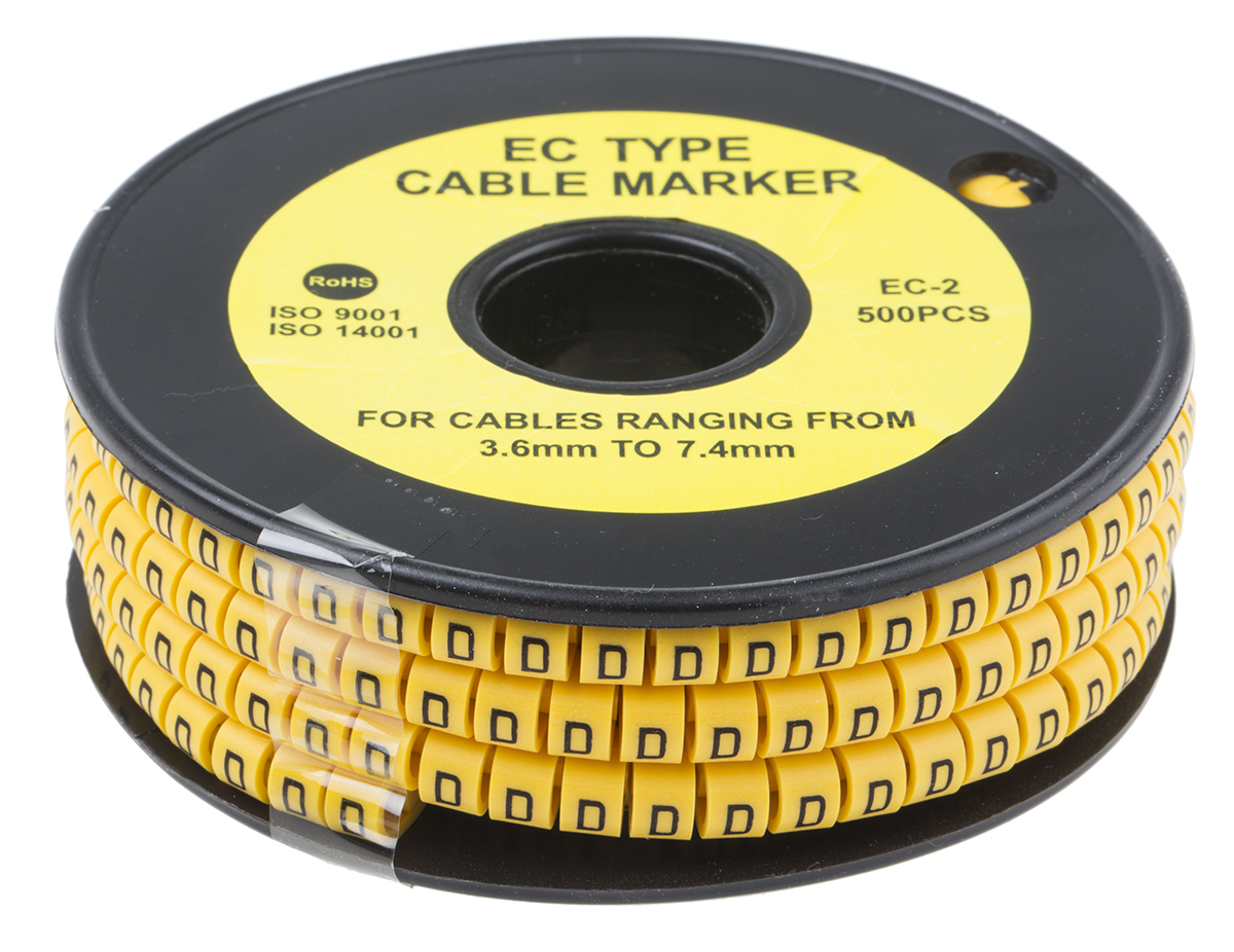 This is Slide On Cable Marker Pre-printed D Black on Yellow 3.6 → 7.4mm Dia. Range manufactured by RS Pro. The manufacturer part number is 812-0979. The product complies with all safety standards, such as rohs compliant. The minimum cable diameter is 3.6mm. The product has maximum of +85 °c of operating temperature range. It has a printable feature no . It has a decent black on yellow colour. The product is made from highly stable and reliable pvc. Whereas, its overall cable diameter range is 3.6 → 7.4mm . Its accurate length is 5mm. A bespoke product is highly resistant to greases, oils. Where they allow slide on affixing mechanism. While the maximum dimeter of the cable is 7.4mm. It has a maximum operating temperature of +85°c. Legend Information: d. Available in 500 quantity.