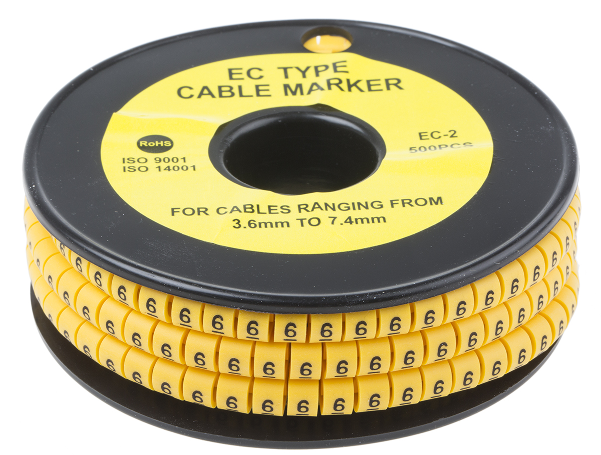 This is Slide On Cable Marker Pre-printed 6 Black on Yellow 3.6 → 7.4mm Dia. Range manufactured by RS Pro. The manufacturer part number is 812-0953. The product complies with all safety standards, such as rohs compliant. The minimum cable diameter is 3.6mm. The product has maximum of +85 °c of operating temperature range. It has a printable feature no . It has a decent black on yellow colour. The product is made from highly stable and reliable pvc. Whereas, its overall cable diameter range is 3.6 → 7.4mm . Its accurate length is 5mm. A bespoke product is highly resistant to greases, oils. Where they allow slide on affixing mechanism. While the maximum dimeter of the cable is 7.4mm. It has a maximum operating temperature of +85°c. Legend Information: 6. Available in 500 quantity.