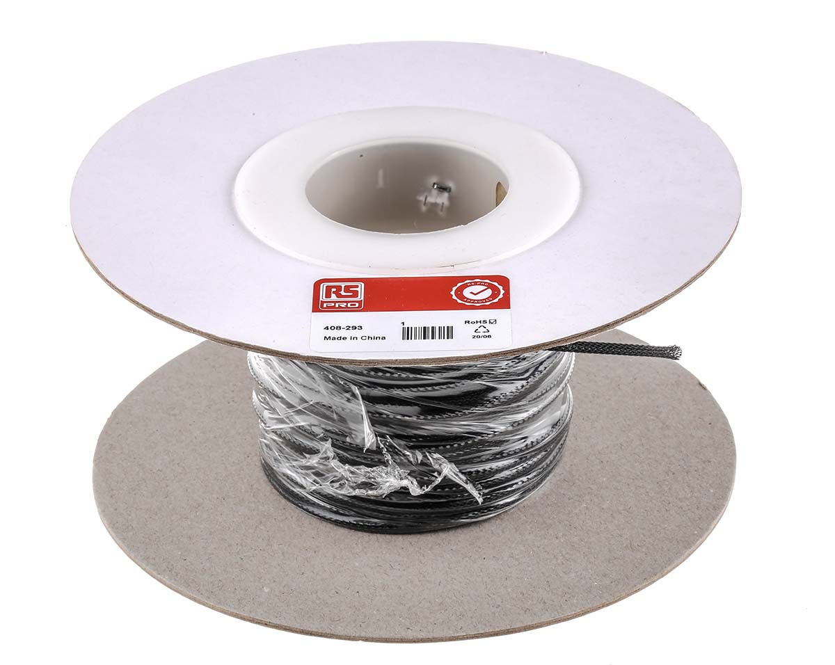 This is Expandable Braided PET Black Cable Sleeve 3mm 30m manufactured by RS Pro. The manufacturer part number is 408-293. The product complies with all safety standards, such as rohs compliant, ul 1441. It has a 3mm diameter. It has a decent black colour. The product is made from highly stable and reliable pet. The minimum cable diameter is 2.36mm. Whereas, the minimum operating temperature of the product is -40°c. While the maximum dimeter of the cable is 6.35mm. The sleeve has a 30m length. Expandable Options - yes. It has a maximum operating temperature of +125°c. It is braided yes .