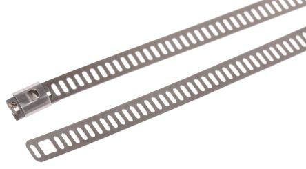 This is Metallic 316 Stainless Steel Ladder Cable Tie 610mm x 12 mm manufactured by RS Pro. The manufacturer part number is 121-646. The product has a flame retardant fire behaviour. The product complies with all safety standards, such as abs, lloyd's, ul. It has a maximum operating temperature of +538°c. It has a decent metallic colour. The product is made from highly stable and reliable 316 stainless steel. The product has an added tensile strength of 1089.76n. Furthermore, the product is 12 mm wide. Its accurate length is 610 mm. Whereas, the minimum operating temperature of the product is -80°c. The bundle has a maximum diameter of 150mm. It comes in ladder configuration. Available in 100 quantity.