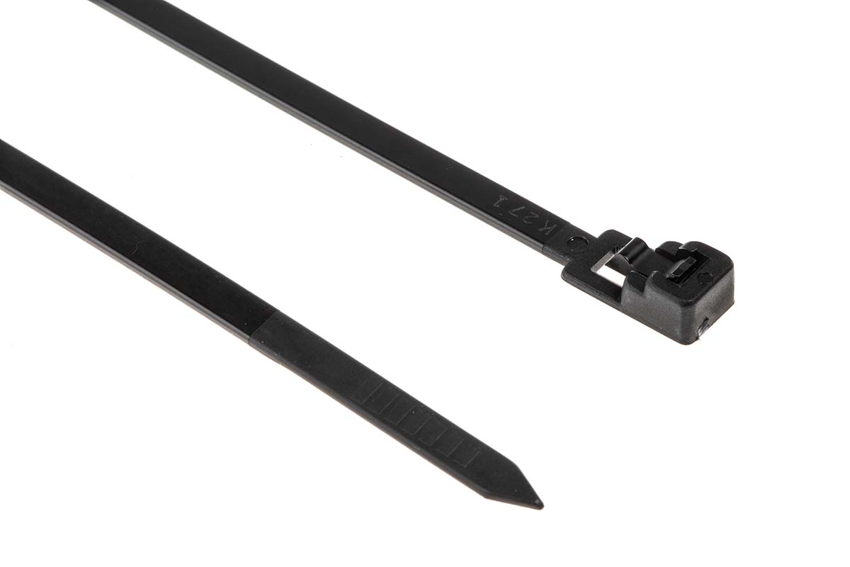 This is Black Nylon Releasable Cable Tie 150mm x 4.5 mm manufactured by RS Pro. The manufacturer part number is 811-1805. The product has a flame retardant fire behaviour. Whereas, the minimum operating temperature of the product is -40°c. It has a maximum operating temperature of +85°c. It has a decent black colour. The product is made from highly stable and reliable nylon 66. The product has an added tensile strength of 215.6n. It has a UV resistant feature no . Furthermore, the product is 4.5 mm wide. Its accurate length is 150mm. The bundle has a maximum diameter of 35mm. It comes in releasable configuration. Available in 100 quantity.