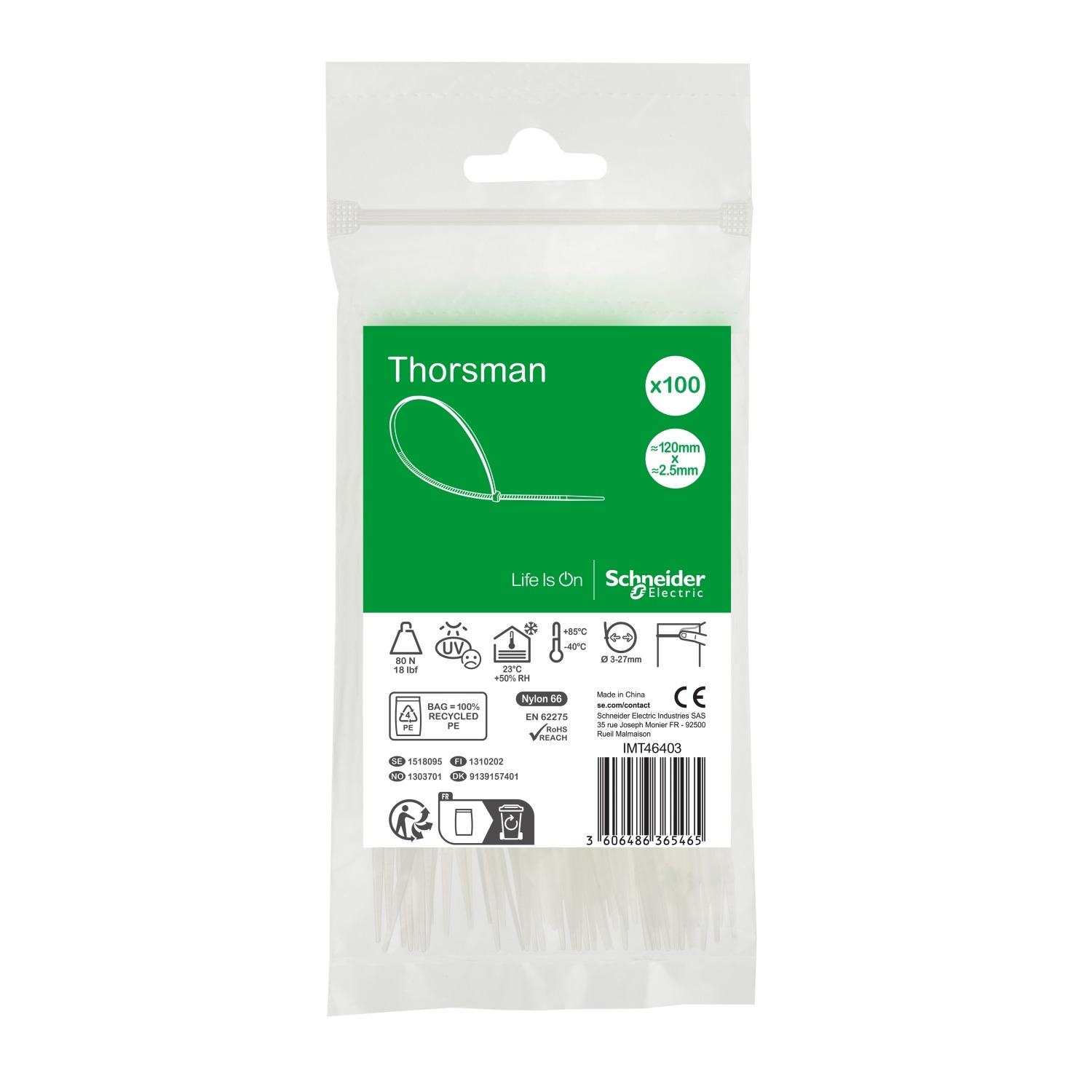 This is Cable Tie 120mm x 2.5 mm Clear Nylon Pk-1 manufactured by Schneider Electric. The manufacturer part number is IMT46403. The product thorsman, is a highly preferred choice for users. It has a decent clear colour. The product is made from highly stable and reliable nylon 66. Furthermore, the product is 2.5 mm wide. Its accurate length is 120mm. It comes in cable tie configuration. Available in 1 quantity.