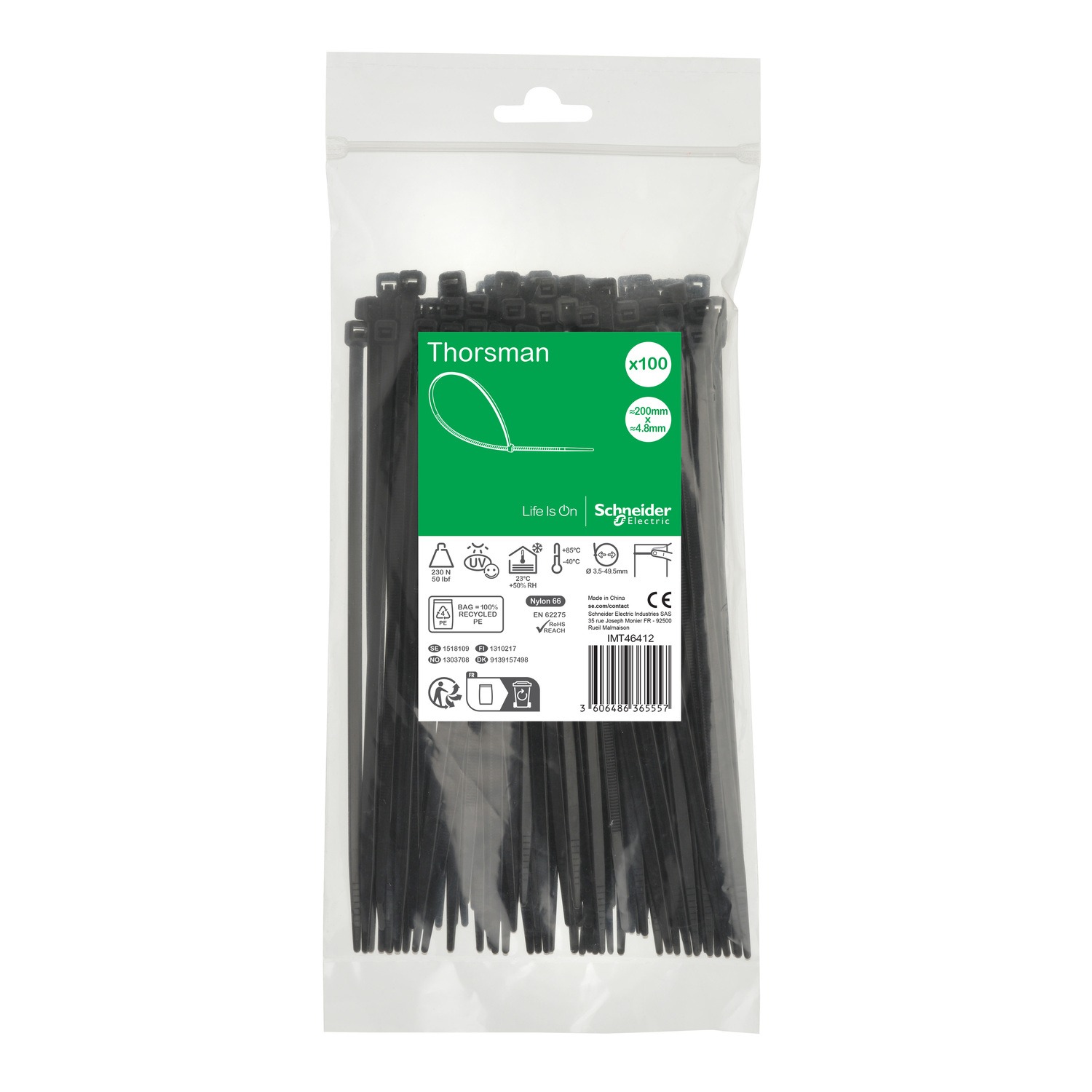 This is Cable Tie 200mm x 4.8 mm Black Nylon Pk-1 manufactured by Schneider Electric. The manufacturer part number is IMT46412. The product thorsman, is a highly preferred choice for users. It has a decent black colour. The product is made from highly stable and reliable nylon 66. Furthermore, the product is 4.8 mm wide. Its accurate length is 200mm. It comes in cable tie configuration. Available in 1 quantity.