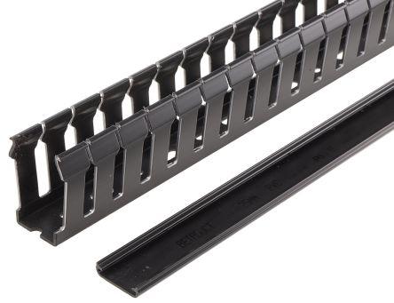 This is Black PVC Open Slot Cable Trunking Slotted Panel Trunking W25 mm x D50mm L1m manufactured by Betaduct. The manufacturer part number is 08870000. It has a decent black colour. The product is made from highly stable and reliable pvc. Its accurate length is 1m. It has a standard open type slot . Furthermore, the product is 25 mm wide. The product comes in 50mm depth. It is created with a/an slotted panel trunking type chain/trunking .