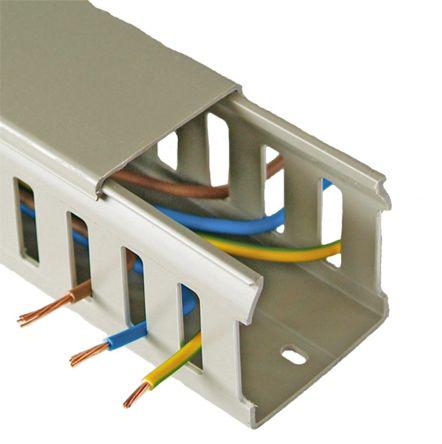 This is Grey PVC Cable Trunking Closed Slot Slotted Panel Trunking manufactured by Betaduct. The manufacturer part number is 10460034. The product has a self-extinguishing fire behaviour. The product complies with all safety standards, such as ce, culus, culus recognised, din 43659, lloyds register, ul 94 v-0, ul e161178a. It has a decent grey colour. The product is made from highly stable and reliable pvc. Its accurate length is 2m. It has a standard closed type slot . Furthermore, the product is 37.5 mm wide. The product comes in 75mm depth. It is created with a/an slotted panel trunking type chain/trunking .