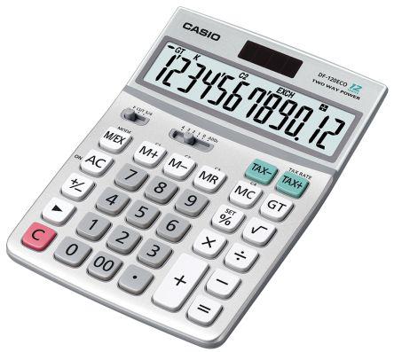 This is Desktop Calculator manufactured by Casio. The manufacturer part number is DF-120ECO-W-EH. It has a standard cr2032 size battery . The typical product's weight is 180g. The product includes battery yes . It has a decent grey colour. It has 12 characters/digits per line . In addition, the height is 35.7mm. Furthermore, the product is 122mm wide. Its accurate length is 174.5mm. Moreover, the product has 1 display lines . It comes in desktop configuration. Moreover, the product gets power from battery, solar.