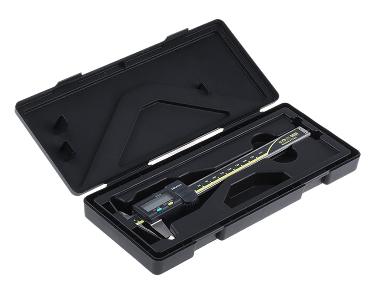 Mitutoyo 150mm Digital Caliper is a precision measuring tool used to measure the internal and external dimensions of an object. It has a stainless-steel body with a large LCD display and a thumb roller for easy operation. It also includes a metric/inch conversion button and an auto-off feature that saves battery life.
