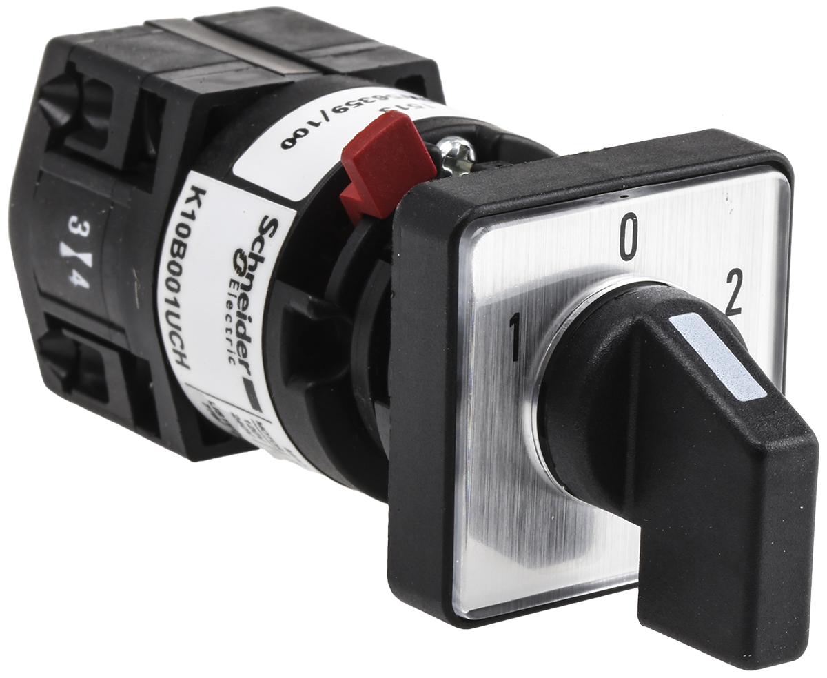 This is 2 positions 60° Rotary Switch 10 A Handle Stay Put manufactured by Schneider Electric. The manufacturer part number is K10B001UCH. It also carries 10a maximum current.