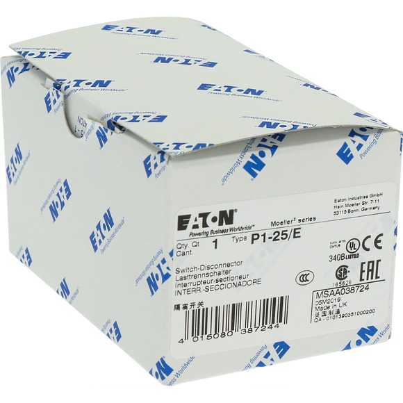 This is 3P 2 Position Rotary Switch 690V ac 25A manufactured by Eaton. The manufacturer part number is 038724 P1-25/E. It also carries 25a maximum current. Moreover, it is designed with 25a switch rating . The product is available in flush mount configuration. It is IP rated with ip65 (front). It has a maximum operating temperature of +50°c. Moreover, the product has a nominal 690v ac voltage rating. Its accurate length is 94mm. It has a model number p1-25. The terminal is a screw type. Furthermore, the product is 49mm wide. The product comes in 70mm depth. It has auxiliary available contacts no . Whereas, the minimum operating temperature of the product is -25°c. Its electrical phase configuration includes 1, 3. It features p1 range. Feature 11kw of power rating. It has equipped with 3 poles. Its handle is of black colour .