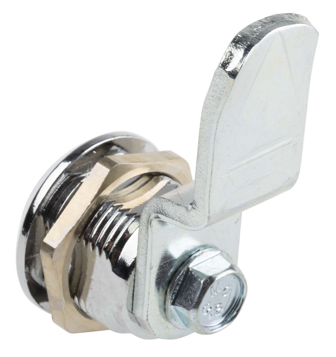 IP65 sealed spanner lock An effective lock mechanism comprising various forms of cylinders: 6 mm square, 8 mm square, 8 mm triangle, 5 mm double bar. The cam features a compression fit and operates through an angle of 90°. This spanner lock is supplied with a 0.3 mm thick nitrile head gasket and nut to be fitted on panels up to 10 mm thick; bright chrome-plated finish. Operating keys supplied separately.