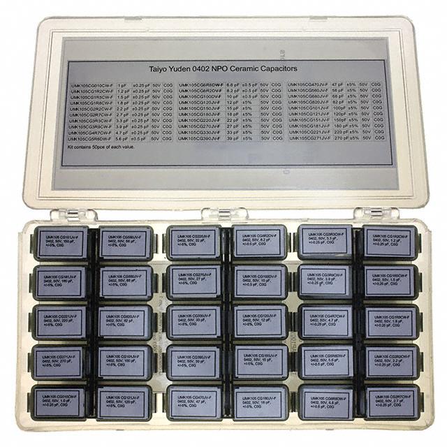 This is manufactured by Taiyo Yuden. The manufacturer part number is 587-1951-KIT. It is assigned with possible HTSUS value of 8532.24.0020. It features ±0.25pf, ±0.5pf, ±5% of tolerance value. It also exhibits voltage rating of 50v. In addition, it is reach unaffected. The product is widely employed in general purpose. The taiyo yuden's product offers user-desired applications. Its typical moisture sensitivity level is 1 (unlimited). It also includes 0402 (1005 metric) packages. Available in 290 pieces (29 values - 10 each) quantity. The ceramic is designed to provide robust applications in a variety of specific settings. The product is available in surface mount, mlcc configuration. The product m, is a highly preferred choice for users. In addition, case is the available packaging type of the product. It features 1pf ~ 270pf capacitance range. The product is designated with the ear99 code number.