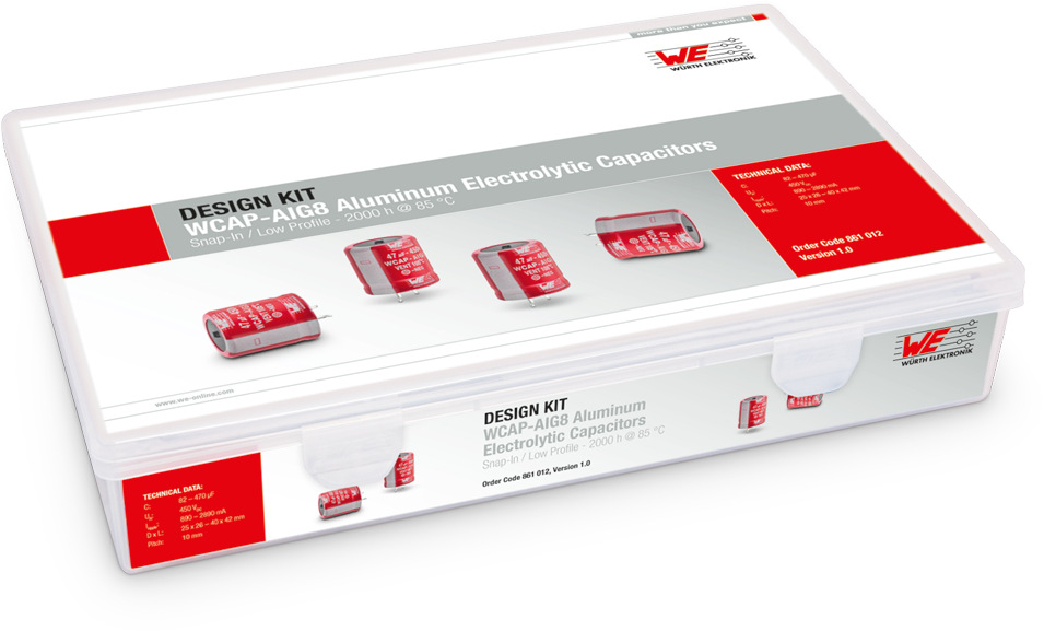 This is Snap-In Aluminium Capacitor Sample Kit manufactured by Wurth Elektronik. The manufacturer part number is 861012. The product is available in snap-in configuration. It has a maximum 450v dc voltage . Moreover, the product is constructed from highly aluminium dielectric material. It has a maximum 470µf capacitance . It has a minimum 82µf capacitance . While the voltage range is 450v dc. It includes a/an aluminium electrolytic capacitors kit . It features 82 μf → 470µf capacitance range. The product consists of 15 pieces.