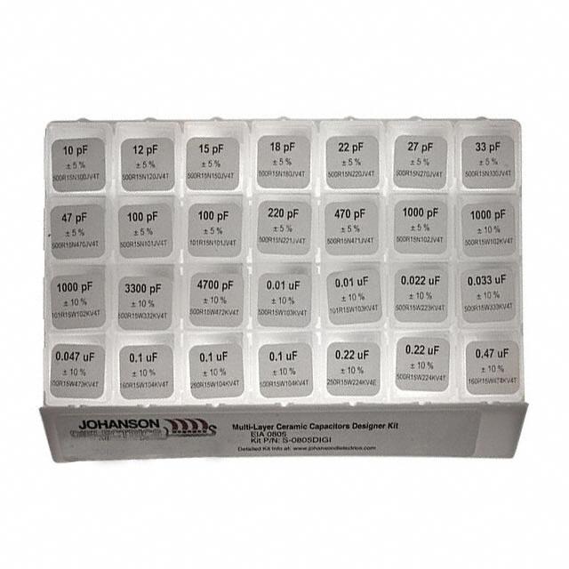 This is manufactured by Johanson Dielectrics Inc.. The manufacturer part number is S-0805. It is assigned with possible HTSUS value of 8532.24.0020. The product is rohs3 compliant. It features ±5%, ±10% of tolerance value. It also exhibits voltage rating of 16 ~ 100v. In addition, it is reach unaffected. The product is widely employed in general purpose. It is shipped in case package . Its typical moisture sensitivity level is 1 (unlimited). It also includes 0805 (2012 metric) packages. Available in 1400 pieces (28 values - 50 each) quantity. The ceramic is designed to provide robust applications in a variety of specific settings. The product is available in surface mount, mlcc configuration. It features 10pf ~ 0.47µf capacitance range. The product is designated with the ear99 code number.