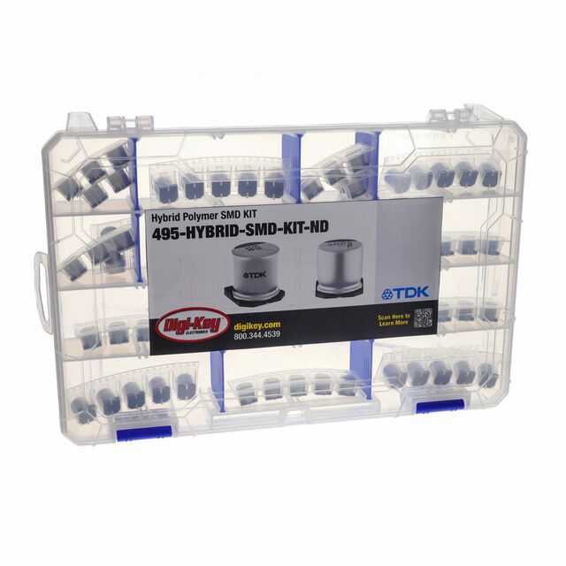 The JEPCOS - TDK Electronics HYBRID-SMD-KIT offers an unparalleled solution for electronic enthusiasts and professionals alike, comprising 70 pieces of aluminium-polymer (hybrid) capacitors ranging from 82µF to 560µF and 25V to 63V. This comprehensive kit covers 14 different values, with 5 capacitors each, ensuring versatility and adaptability to various projects and applications. Crafted with precision and reliability, the capacitors boast surface mount technology, facilitating seamless integration into circuit boards with ease.