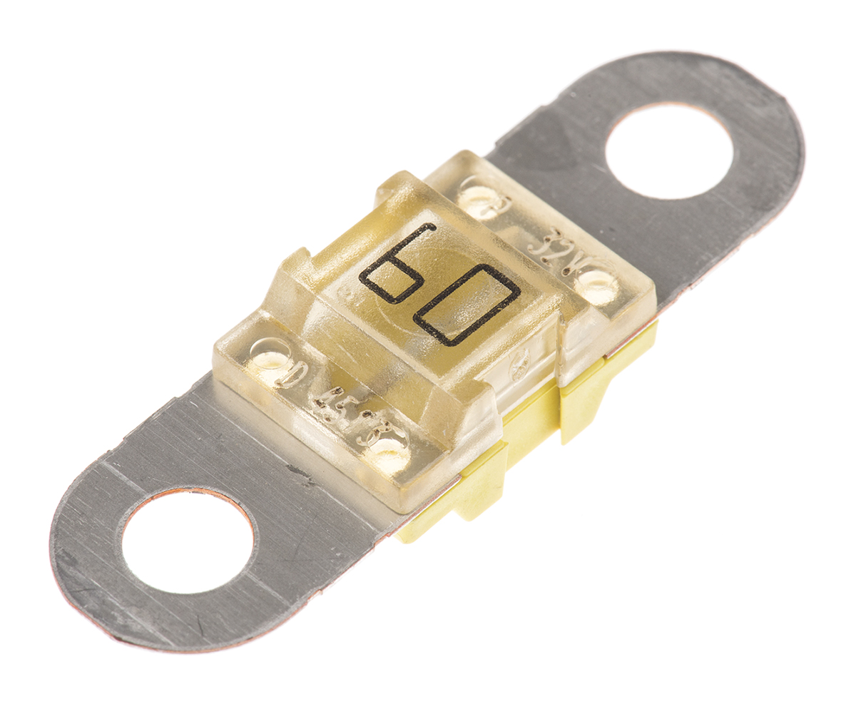 This is 60A Yellow BF1 Automotive Bolt-down Fuse 32V dc manufactured by Pudenz. The manufacturer part number is 153.5631.5601. The product has a current rating of 60a. Moreover, the product has a nominal 32v dc voltage rating. The product bf1, is a highly preferred choice for users. It has a decent yellow colour. The product has -40 → +125 °c of operating temperature range. The product's body is nicely designed from thermoplastic materials. The product has 2000 a breaking capacity at maximum voltage rating. In addition, the height is 8mm. Furthermore, the product is 12mm wide. Its accurate length is 42mm. It integrates a bf1 fuse type. Furthermore, the product has an overall dimensions of 42 x 8 x 12mm. Whereas, the minimum operating temperature of the product is -40°c. It is of [Number of Sockets] UL class . The fuse has a robust t speed. It has a maximum operating temperature of +125°c.