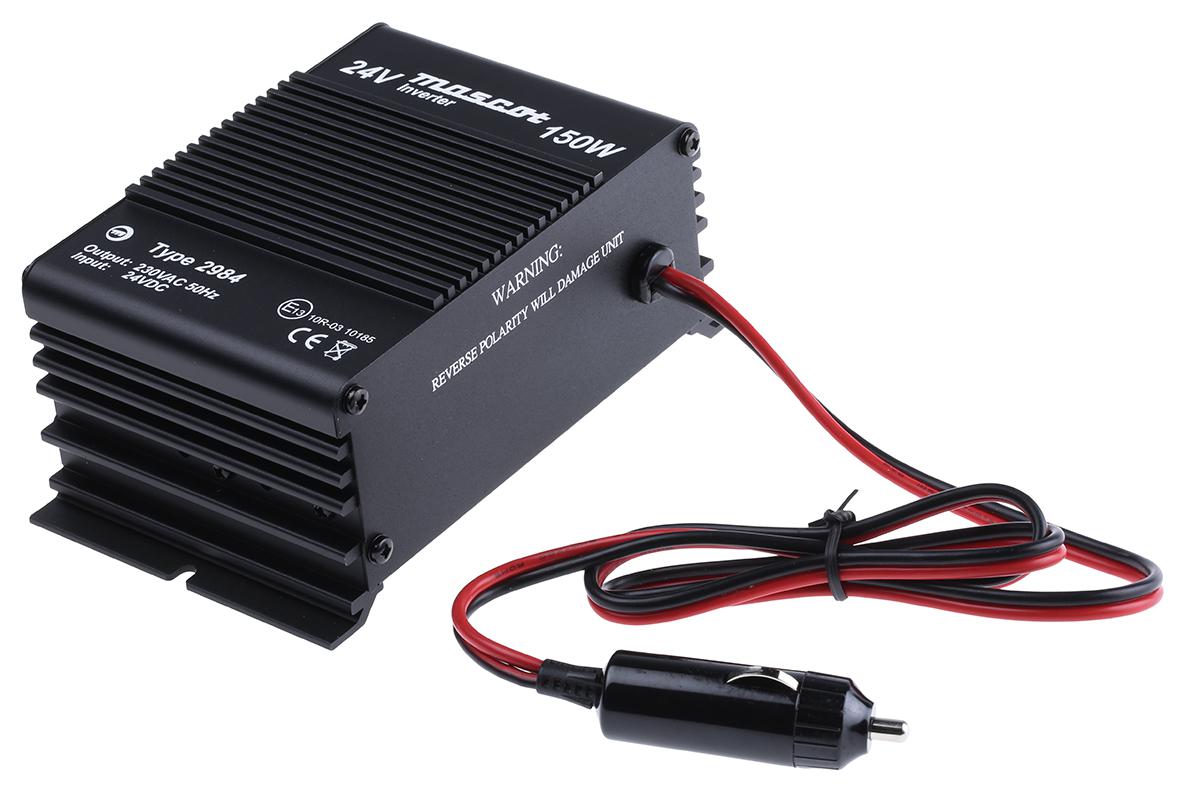 This is 150W DC-AC Car Power Inverter 24V dc / 230V ac manufactured by Mascot. The manufacturer part number is 2984000045. The product has +30°c maximum temperature. The typical product's weight is 770g. It is a highly efficient product with an 90% of high efficiency. While its minimum temperature is 0°c. It has a standard european plug type output connection . Its accurate length is 148.5mm. It offers a continuous 150w output power . Furthermore, the product is 127.5mm wide. The product comes in 66mm depth. The MTBF values include 60000h. It has quasi sine wave output power waveform . Features a 230v ac output voltage. It has about 300w intermittent output power . Its input voltage is 24v dc.