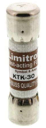 This is LIMITRON KTK Melamine Cartridge Fuse 30A Fuse Speed F 10 x 38mm manufactured by Cooper Bussmann. The manufacturer part number is KTK-30. The product has a current rating of 30 a. Moreover, the product has a nominal 600 v ac voltage rating. The product ktk, is a highly preferred choice for users. A fuse with a 10 x 38mm size. The product's body is nicely designed from melamine materials. The fuse has a robust f speed.