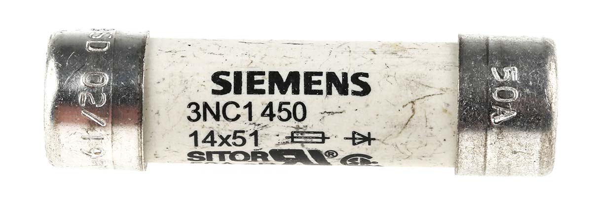 This is Cartridge Fuse 50A 14 x 51mm manufactured by Siemens. The manufacturer part number is 3NC1450. The product has a ar application category. A fuse with a 14 x 51mm size. The product has a current rating of 50a. Moreover, the product has a nominal 690v ac voltage rating.
