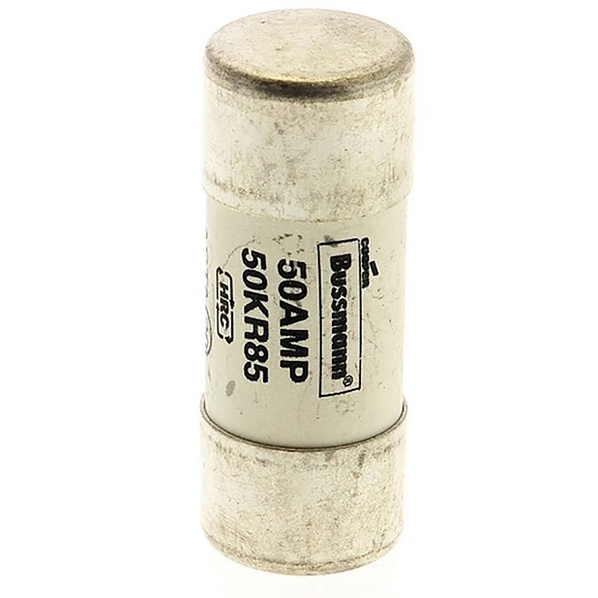 This is 50A Ceramic Cartridge Fuse 23 x 57mm manufactured by Eaton. The manufacturer part number is 50KR85. The product has a gg application category. The product has a current rating of 50a. Moreover, the product has a nominal 415v ac voltage rating. A fuse with a 23 x 57mm size. The product's body is nicely designed from ceramic materials. The fuse complies with bs88-3 standards.