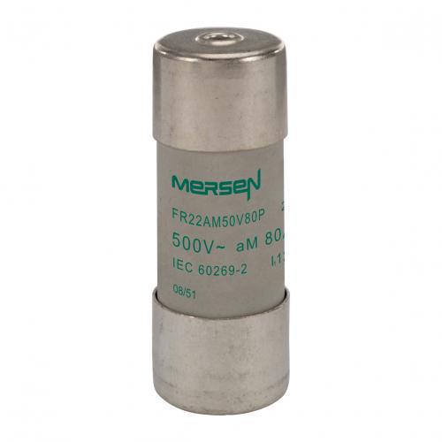 This is 80A aM Ceramic Cartridge Fuse 22.2 x 58mm manufactured by Mersen. The manufacturer part number is Z218729. The product has a current rating of 80a. Moreover, the product has a nominal 500v ac voltage rating. A fuse with a 22.2 x 58mm size. The product's body is nicely designed from ceramic materials. The fuse has a robust am speed.