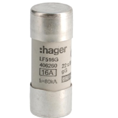 This is 16A Cartridge Fuse 22.2 x 58mm manufactured by Hager. The manufacturer part number is LF516G. A fuse with a 22.2 x 58mm size. The product has a current rating of 16a. Moreover, the product has a nominal 690v voltage rating.