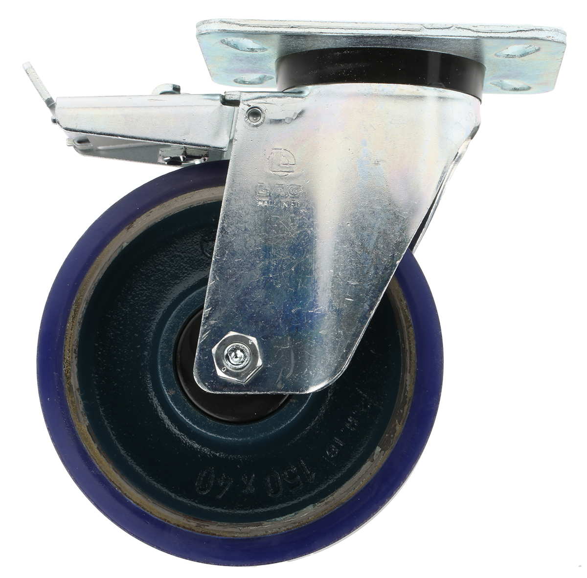 This is Swivel Castor 450kg manufactured by LAG. The manufacturer part number is 37413FR. The tyre of the product is made up of polyurethane material . Moreover, its fixing plate dimensions are 110 x 135mm . It has approximately 10mm fixing hole size . The product is available in bolt hole configuration. It includes brake yes . It has a typical 80 x 105mm fixing centres . Moreover, it has 190mm of overall height. It can holds up to 450kg load capacity. The product also features robust zinc plated steel housing material. It is created for heavy duty weight class . The product has a ball bearing type hub bearing . It has a wheel about 40mm in width . Its wheel diameter is about 150mm . Its hub is made using cast iron material . Allows braked swivel rotation. Additionally, it includes 4 fixing holes .