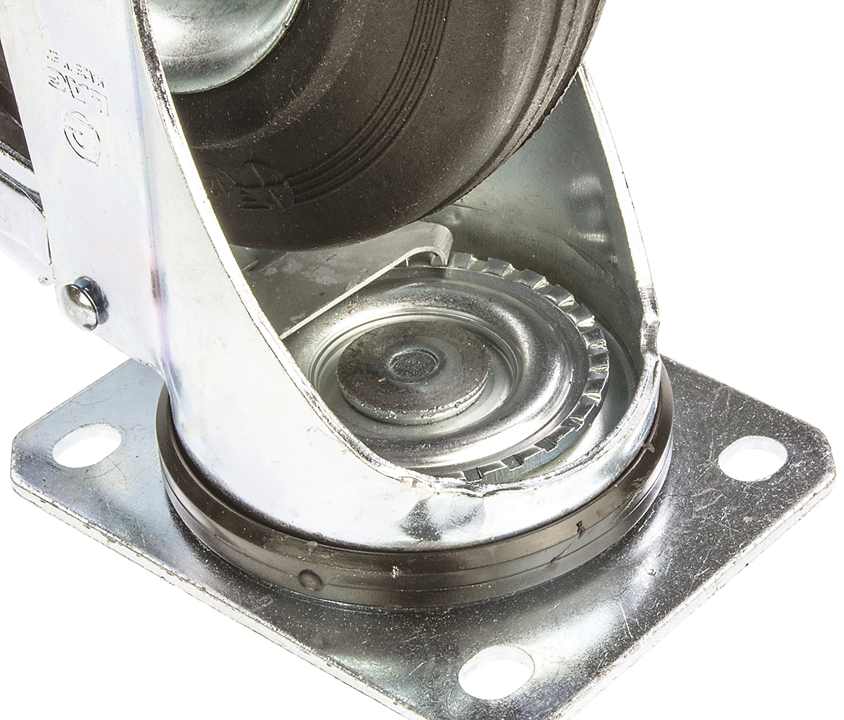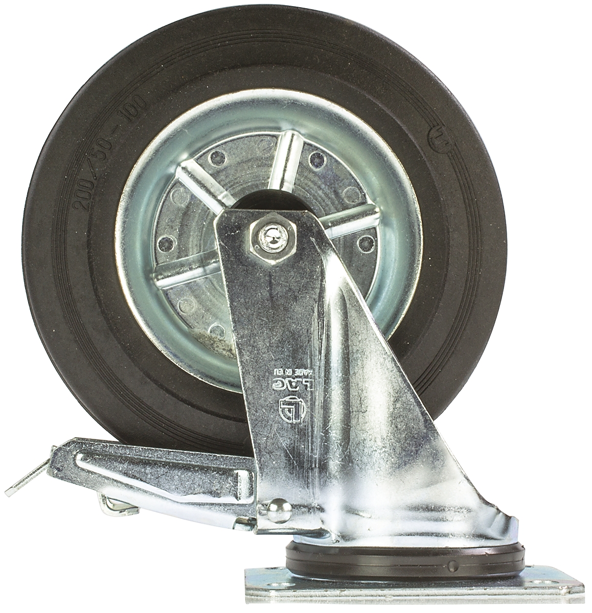 This is Swivel Castor 12286 FR 230kg manufactured by LAG. The manufacturer part number is 12286 FR. The tyre of the product is made up of rubber material . Moreover, its fixing plate dimensions are 135 x 110mm . It has approximately 10mm fixing hole size . The product is available in plate configuration. It includes brake yes . It has a typical 105 x 80mm fixing centres . Moreover, it has 240mm of overall height. It can holds up to 230kg load capacity. The product also features robust zinc plated steel housing material. It is created for medium duty weight class . The product has a roller bearing type hub bearing . It has a wheel about 50mm in width . Its wheel diameter is about 200mm . Its hub is made using steel material . Allows braked swivel rotation. Additionally, it includes 4 fixing holes .