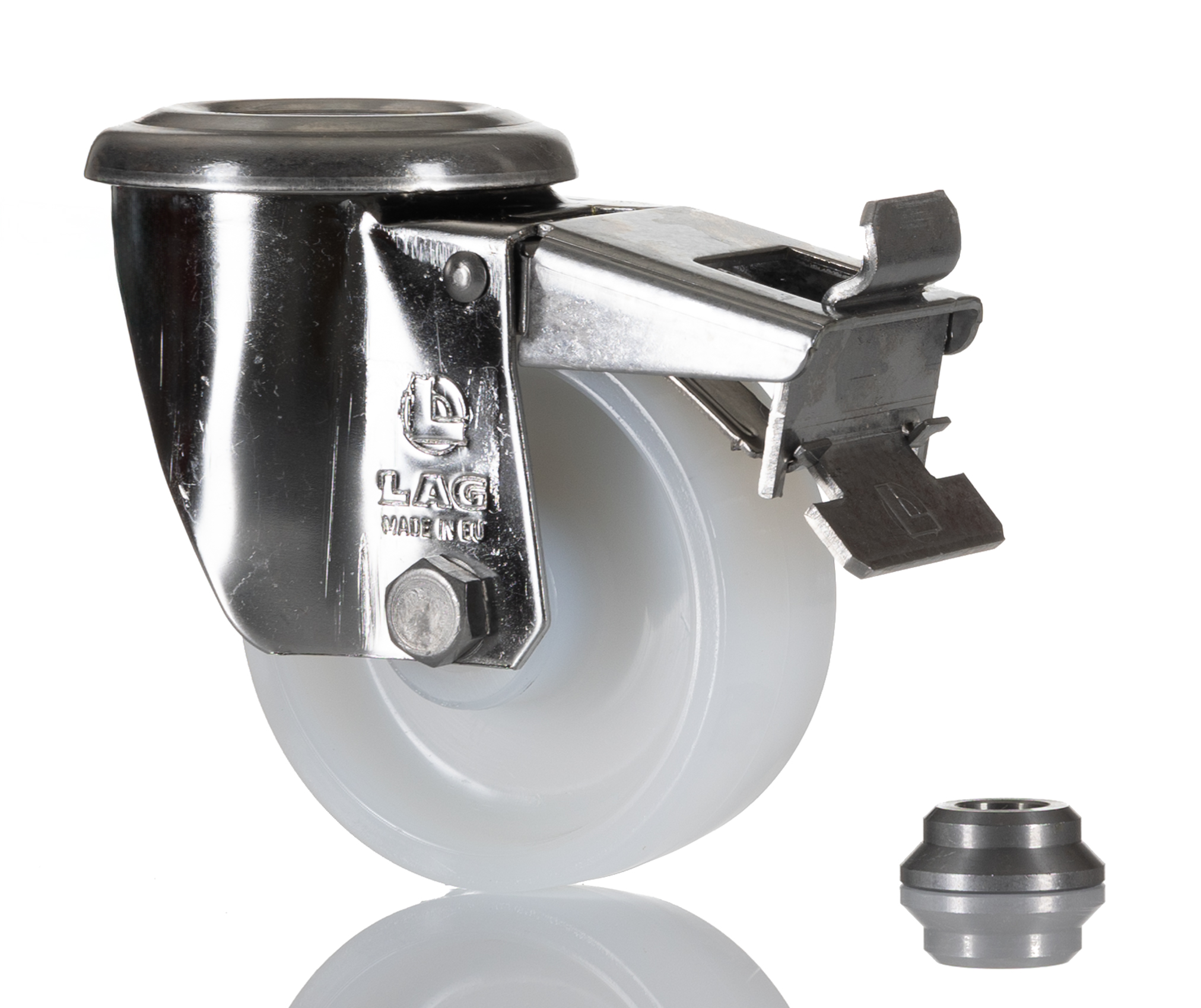 This is Stem Swivel Castors 150kg Polyamide tyres manufactured by LAG. The manufacturer part number is 17227 FR HB. The tyre of the product is made up of polyamide material . It has approximately 12mm fixing hole size . The product is available in bolt hole configuration. It includes brake yes . Moreover, it has 106mm of overall height. It can holds up to 150kg load capacity. The product also features robust stainless steel housing material. It is created for medium duty weight class . The product has a plain bore type hub bearing . It has a wheel about 30mm in width . Its wheel diameter is about 80mm . Its hub is made using polyamide material . Allows swivel rotation. Additionally, it includes 1 fixing holes .