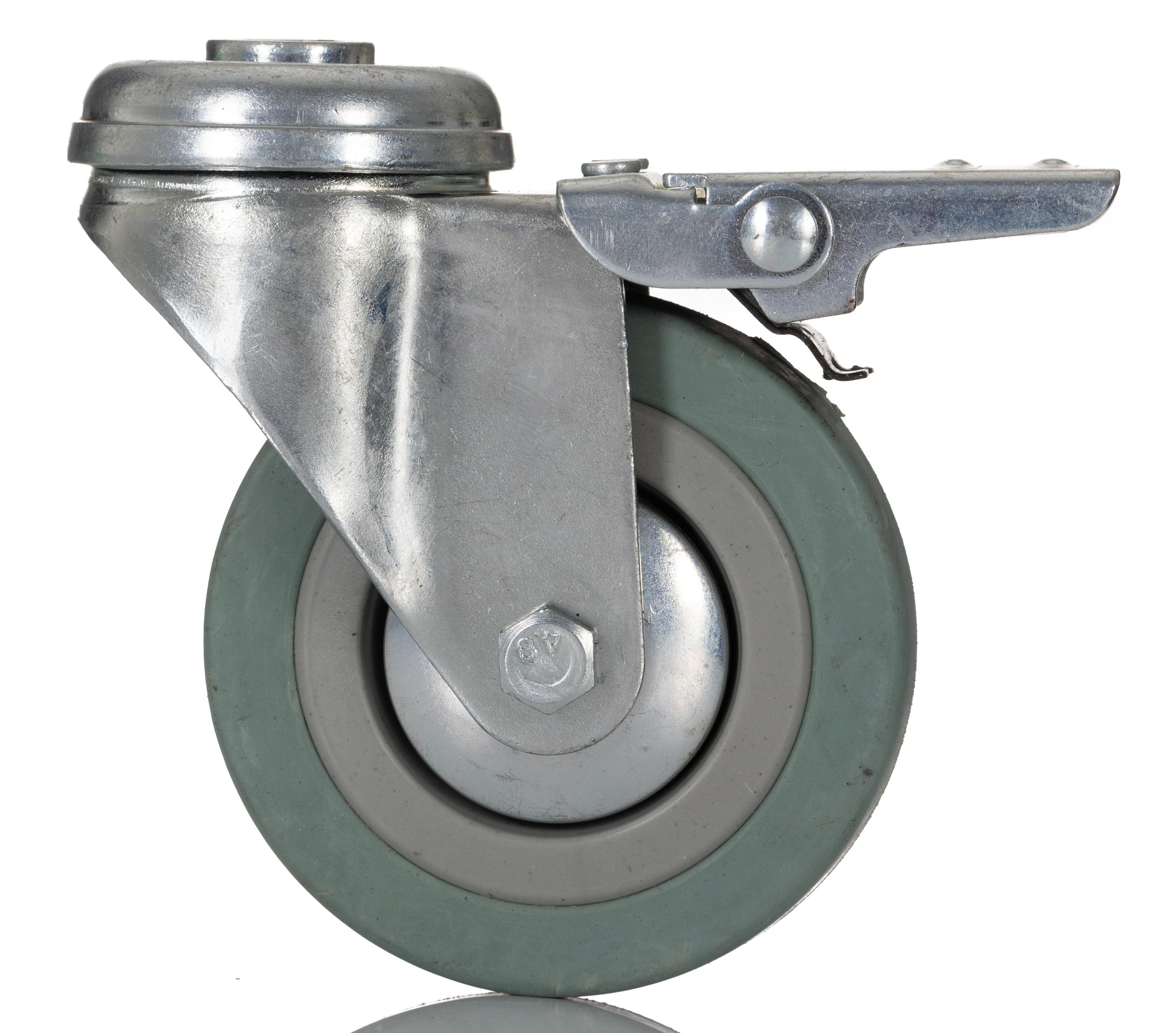 This is Stem Swivel Castors GPBH075RPBR 70kg Rubber tyres manufactured by RS Pro. The manufacturer part number is 828-6344. The tyre of the product is made up of rubber material . It has approximately 10mm fixing hole size . The product is available in single bolt configuration. It includes brake yes . Moreover, it has 100mm of overall height. It can holds up to 70kg load capacity. The product also features robust steel housing material. It is created for light duty weight class . The product has a plain bearing type hub bearing . It has a wheel about 21mm in width . Its wheel diameter is about 75mm . Its hub is made using polypropylene material . Allows braked swivel rotation. Additionally, it includes 1 fixing holes .