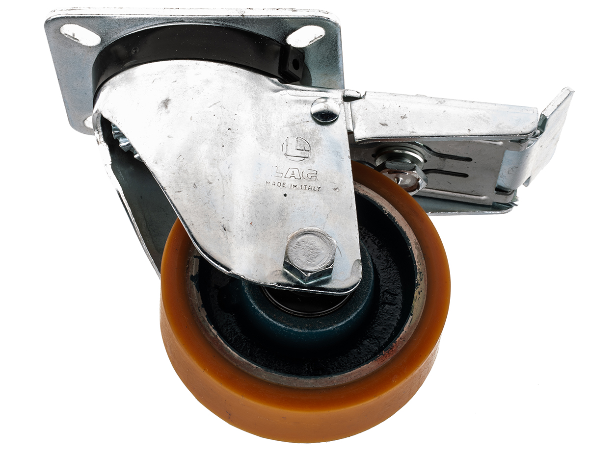 This is Swivel Castor 300kg manufactured by LAG. The manufacturer part number is 23603 FR. The tyre of the product is made up of polyurethane material . Moreover, its fixing plate dimensions are 105 x 85mm . It has approximately 8mm fixing hole size . The product is available in plate configuration. It includes brake yes . It has a typical 80 x 60mm fixing centres . Moreover, it has 137mm of overall height. It can holds up to 300kg load capacity. The product also features robust zinc plated steel housing material. It is created for medium duty weight class . The product has a ball bearing type hub bearing . It has a wheel about 30mm in width . Its wheel diameter is about 100mm . Its hub is made using cast iron material . Allows braked swivel rotation. Additionally, it includes 4 fixing holes .