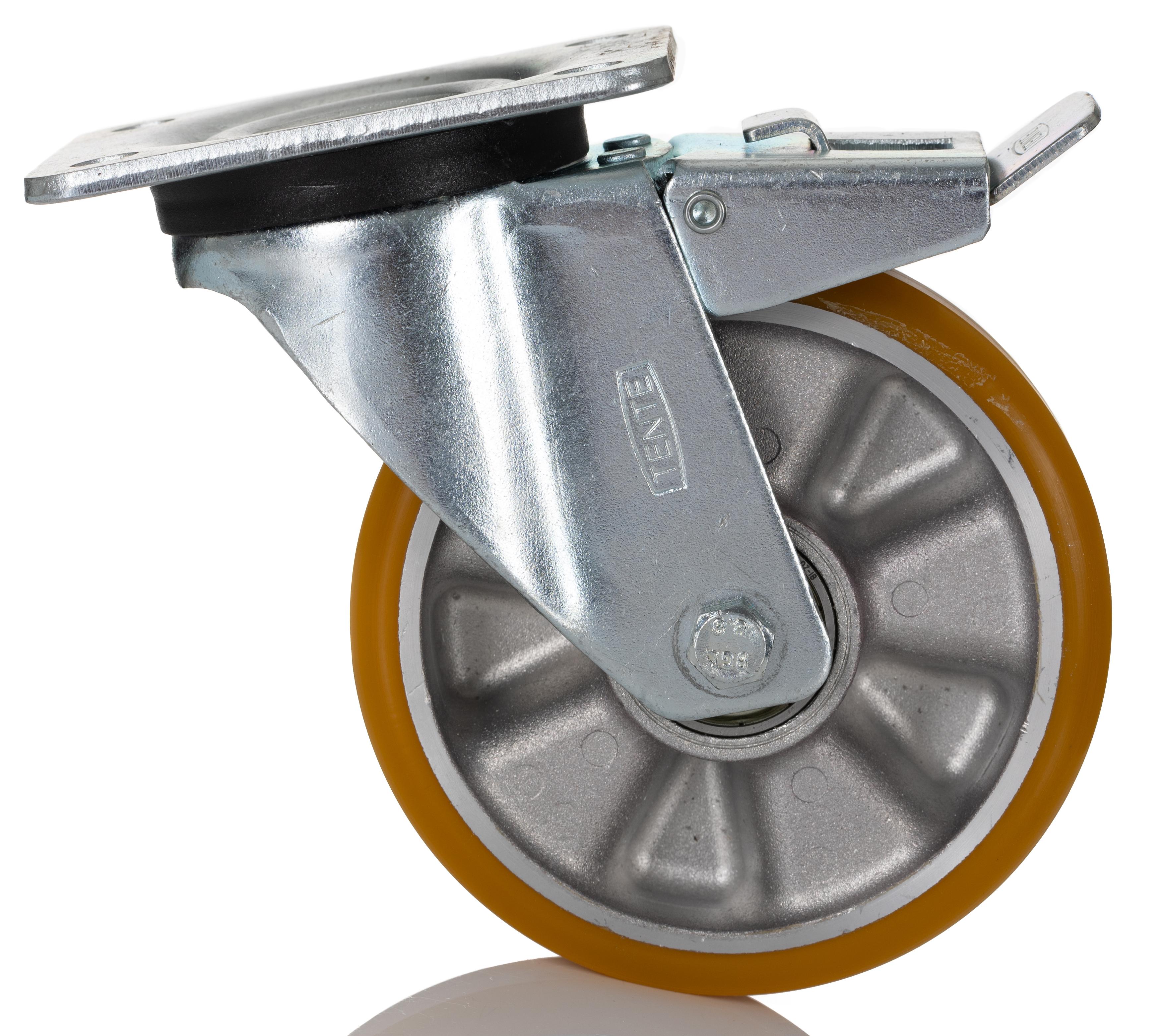 This is Swivel Castor 300kg manufactured by Tente. The manufacturer part number is 3677ITP125P62. The tyre of the product is made up of polyurethane material . Moreover, its fixing plate dimensions are 105 x 85mm . It has approximately 9mm fixing hole size . The product is available in plate configuration. It includes brake yes . It has a typical 80 x 60mm fixing centres . Moreover, it has 157mm of overall height. It can holds up to 300kg load capacity. It is created for heavy duty weight class . The product has a ball bearing type hub bearing . It has a wheel about 40mm in width . Its wheel diameter is about 125mm . Its hub is made using aluminium material . Allows braked swivel rotation. Additionally, it includes 4 fixing holes .