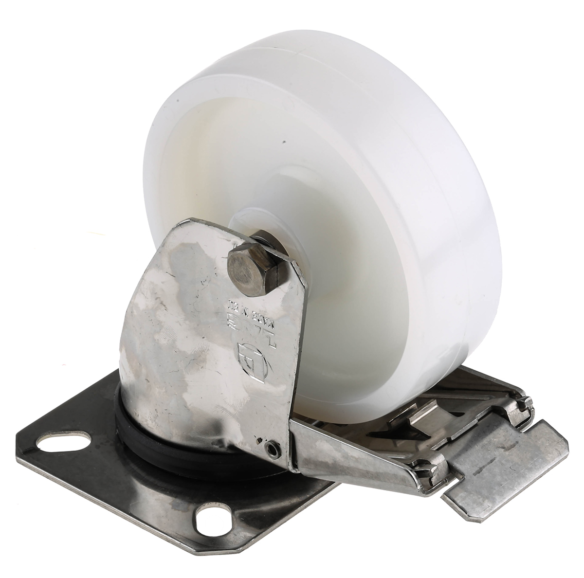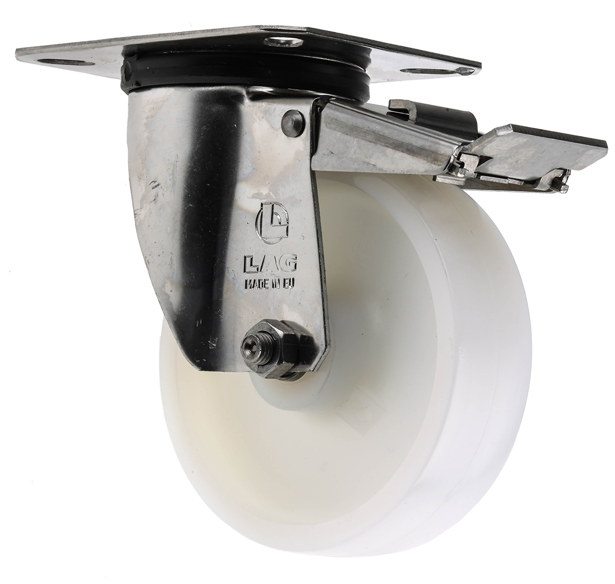 This is Swivel Castor 150kg manufactured by LAG. The manufacturer part number is 17130 FR. The tyre of the product is made up of polyamide material . Moreover, its fixing plate dimensions are 102 x 83mm . It has approximately 8mm fixing hole size . The product is available in plate configuration. It includes brake yes . It has a typical 80 x 60mm fixing centres . Moreover, it has 128mm of overall height. It can holds up to 150kg load capacity. The product also features robust stainless steel housing material. It is created for medium duty weight class . The product has a plain bore type hub bearing . It has a wheel about 30mm in width . Its wheel diameter is about 100mm . Its hub is made using polyamide material . Allows braked swivel rotation. Additionally, it includes 4 fixing holes .