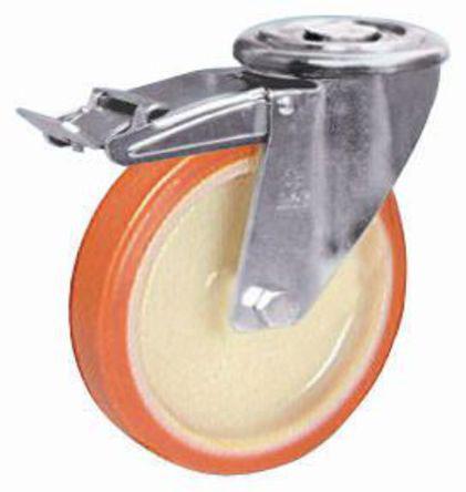 This is Stem Swivel Castors 250kg PUR tyres manufactured by LAG. The manufacturer part number is 19208 FR HC. The tyre of the product is made up of polyurethane material . It has approximately 14mm fixing hole size . The product is available in bolt hole configuration. It includes brake yes . Moreover, it has 160mm of overall height. It can holds up to 250kg load capacity. It is created for medium duty weight class . The product has a roller bearing type hub bearing . It has a wheel about 30mm in width . Its wheel diameter is about 125mm . Its hub is made using polyamide material . Allows swivel rotation. Additionally, it includes 1 fixing holes .