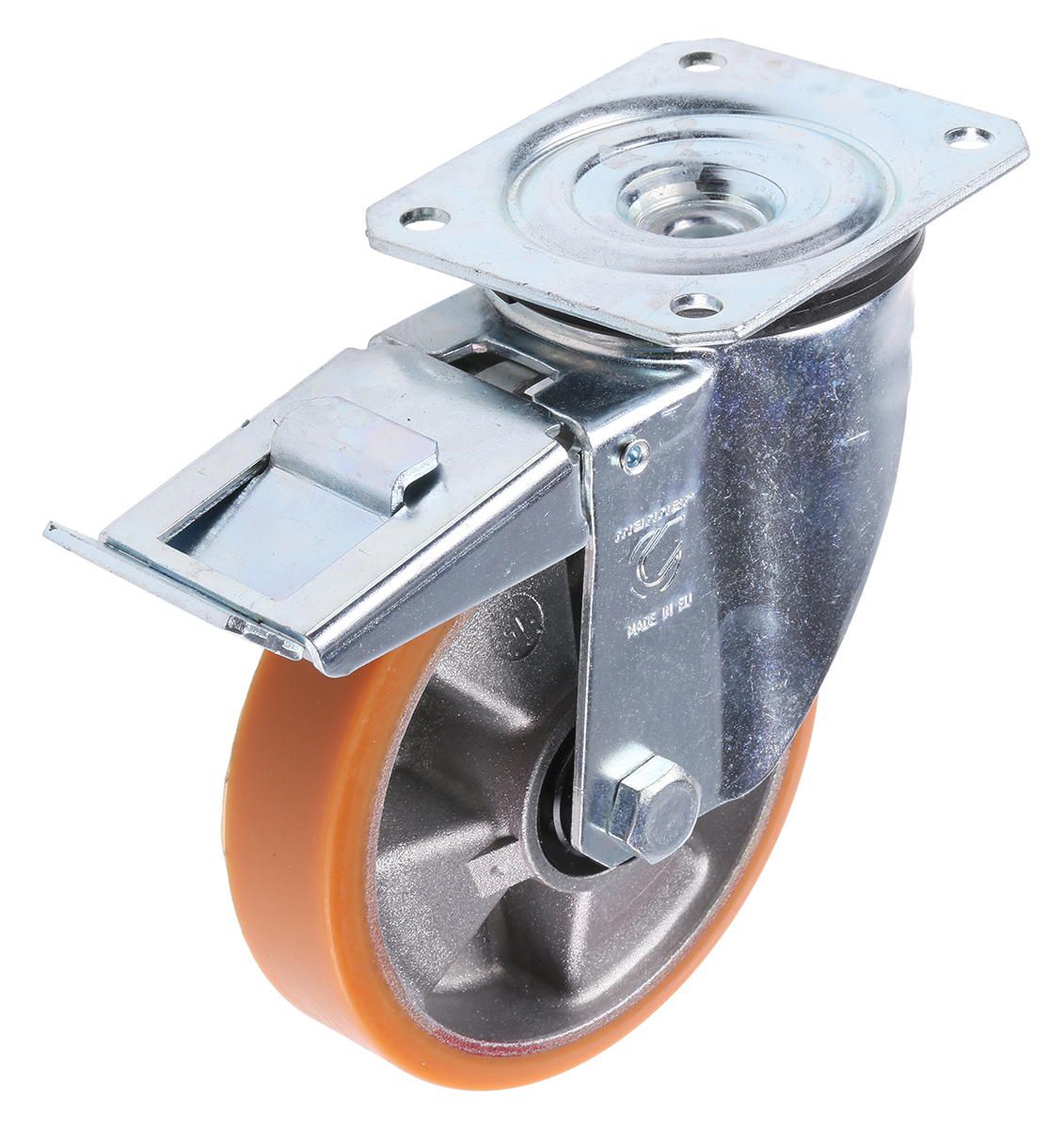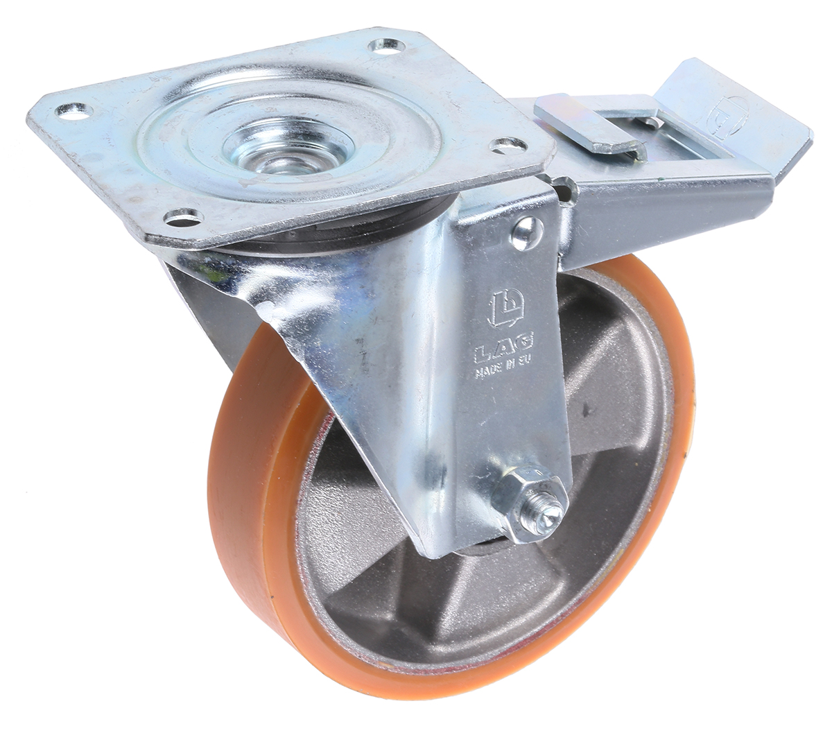 This is Swivel Castor 26058 FR 200kg manufactured by LAG. The manufacturer part number is 26058 FR. The tyre of the product is made up of polyurethane material . Moreover, its fixing plate dimensions are 102 x 83mm . It has approximately 8mm fixing hole size . The product is available in plate configuration. It includes brake yes . It has a typical 80 x 60mm fixing centres . Moreover, it has 160mm of overall height. It can holds up to 200kg load capacity. The product also features robust zinc plated steel housing material. It is created for medium duty weight class . The product has a roller bearing type hub bearing . It has a wheel about 30mm in width . Its wheel diameter is about 125mm . Its hub is made using die cast aluminium material . Allows braked swivel rotation. Additionally, it includes 4 fixing holes .